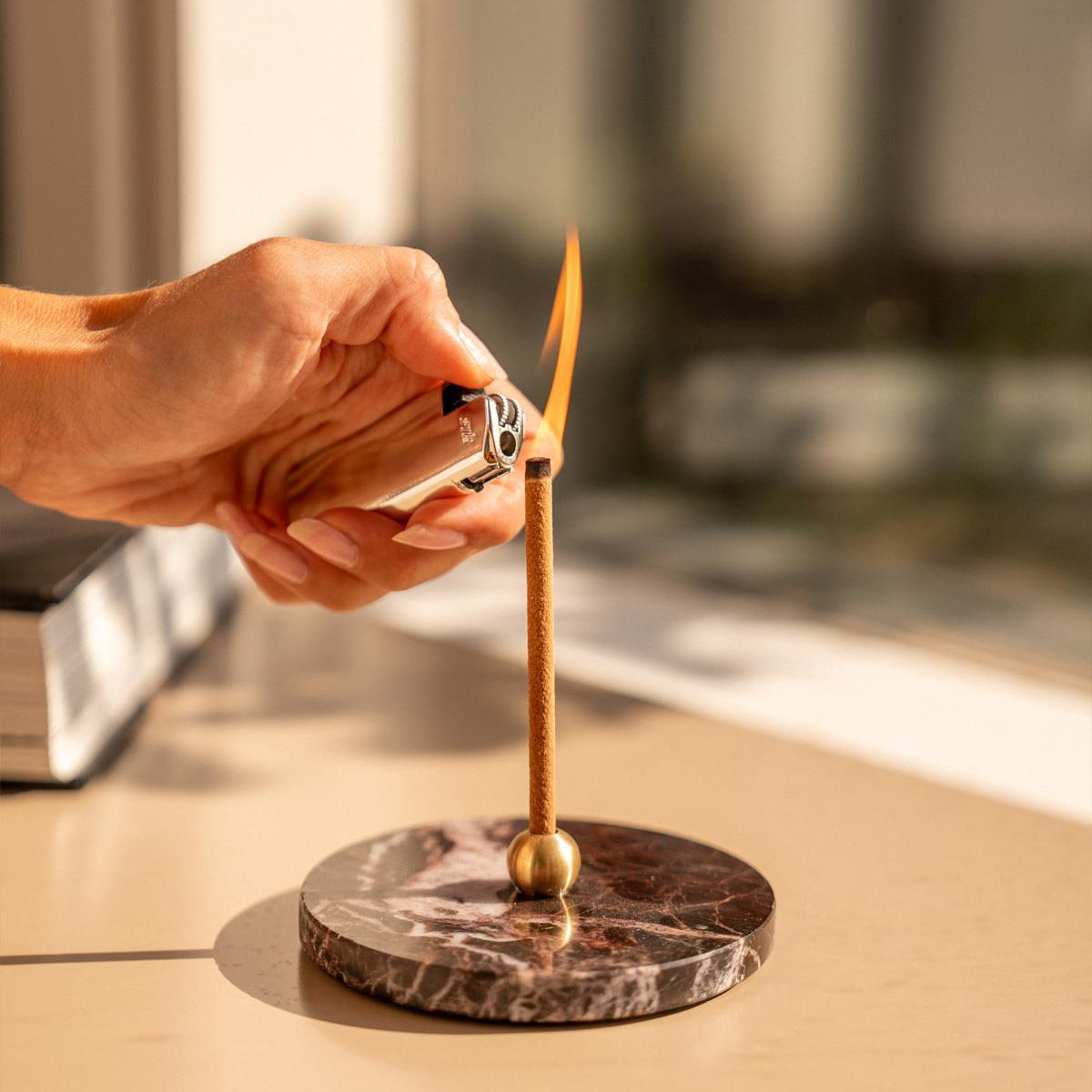 Golden Cherry Stick tütsülük,vişne mermeri taban ve pirinç detaylarıyla hem şık hem de işlevsel bir dekoratif obje sunar.