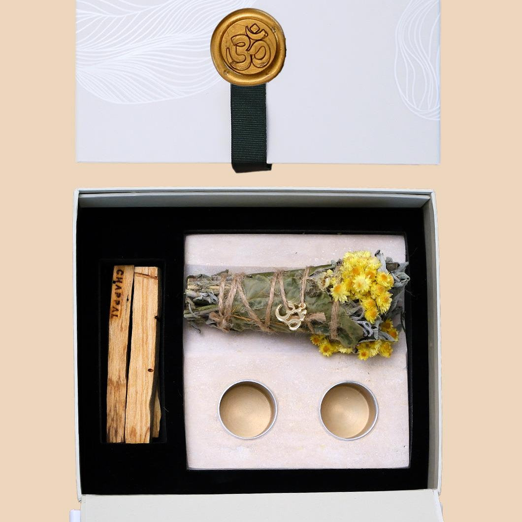Yoga Meditasyon Seti, bitkisel tütsü demeti, 3 adet Palo Santo, traverten tütsülük ve özel tasarım kutudan oluşur.