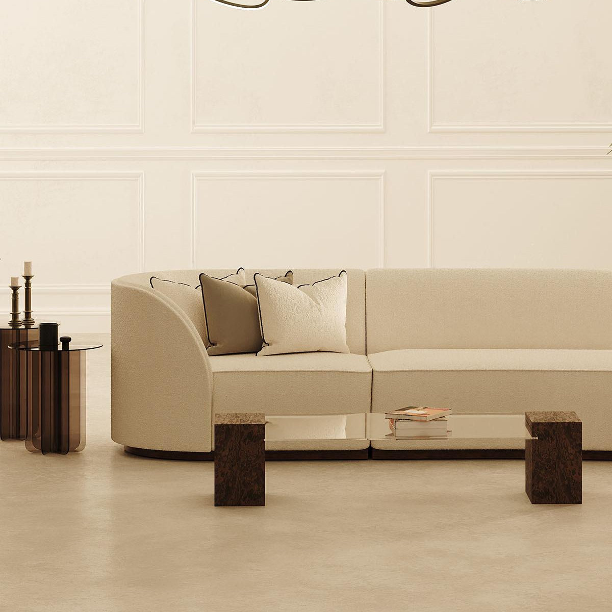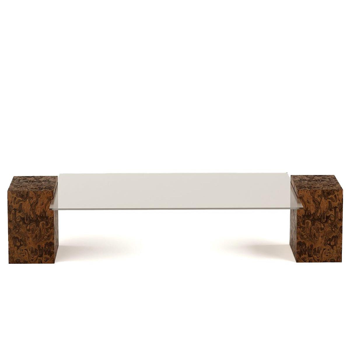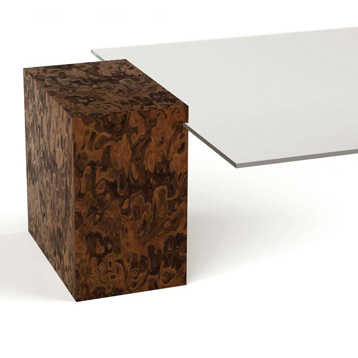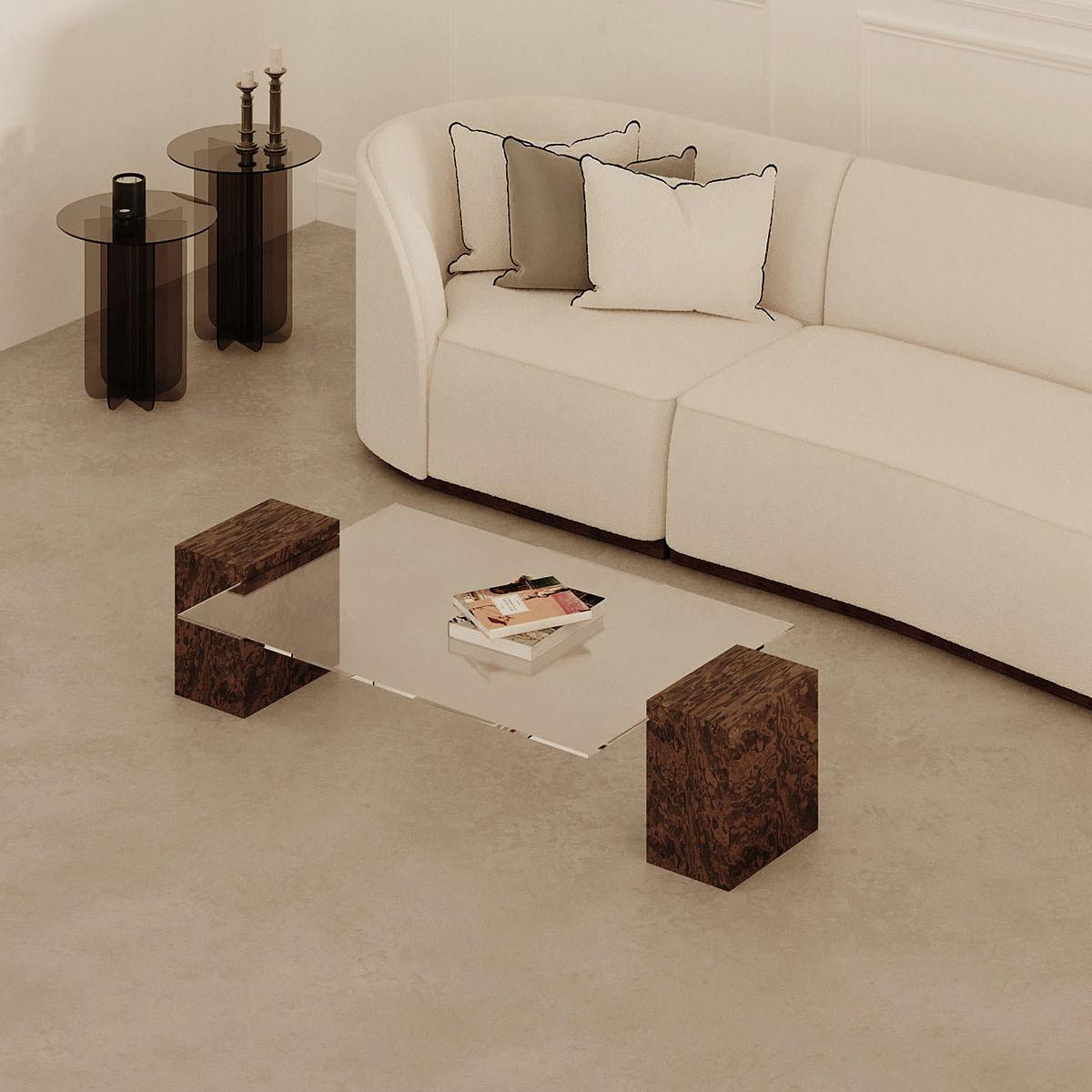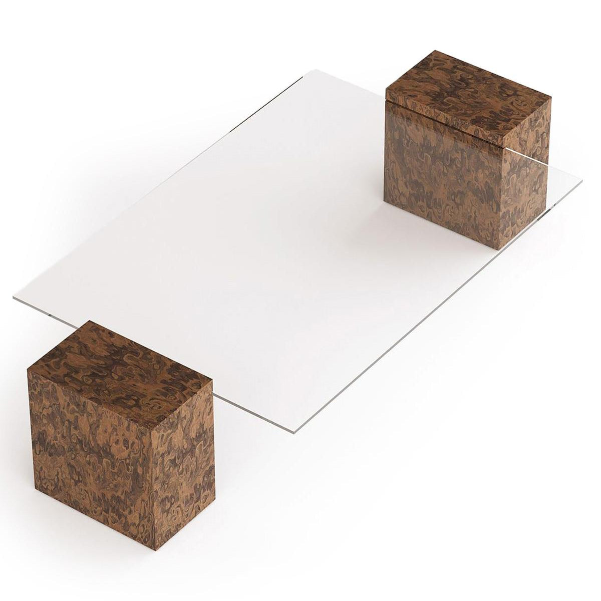 "Burl Ahşap Sehpa, ahşap kök kaplamalı küpler ile birlikte minimalist bir tasarımla şekilleniyor.