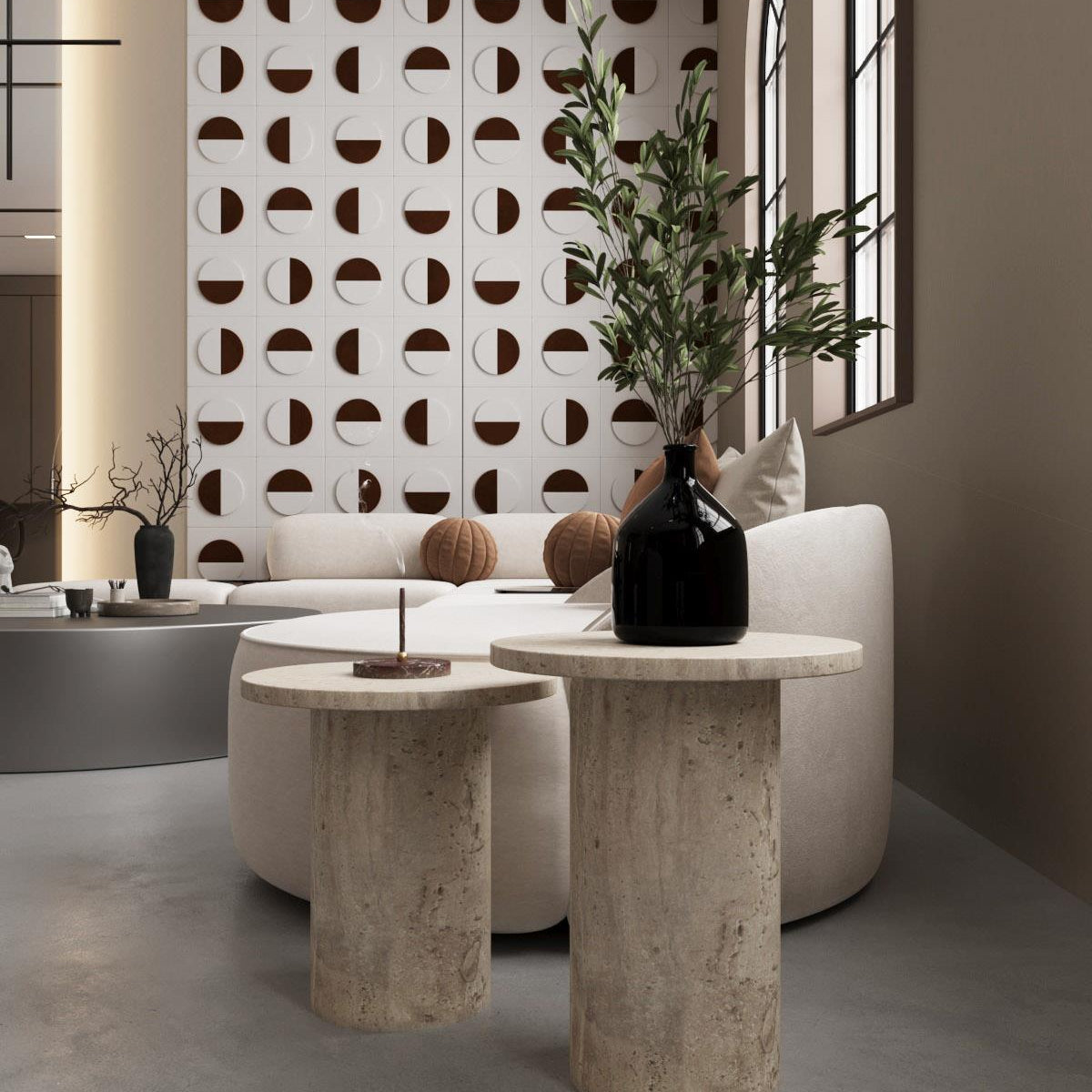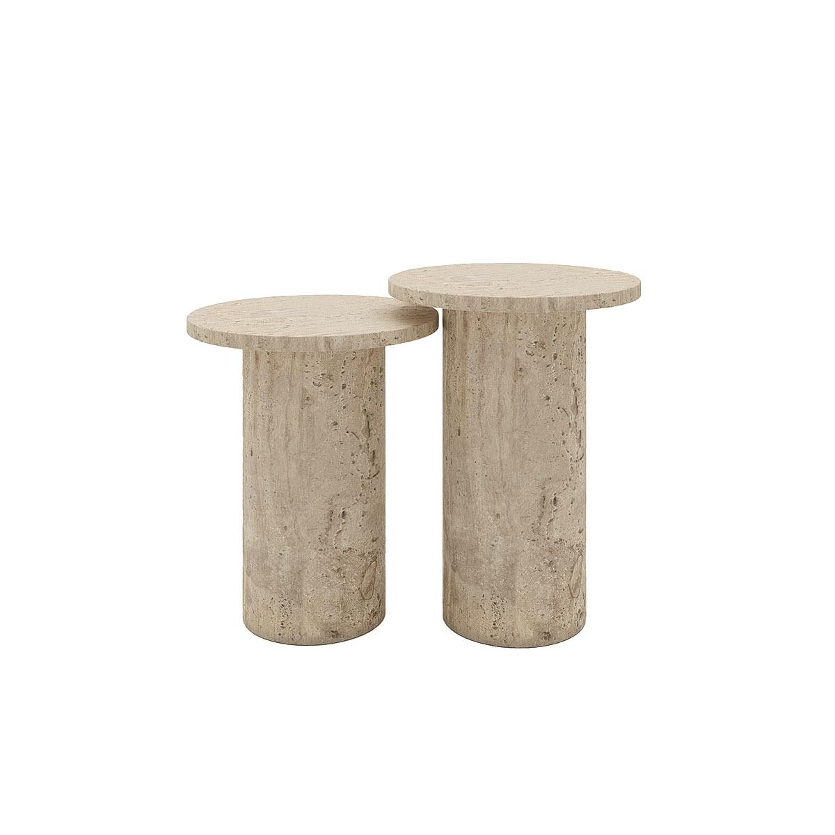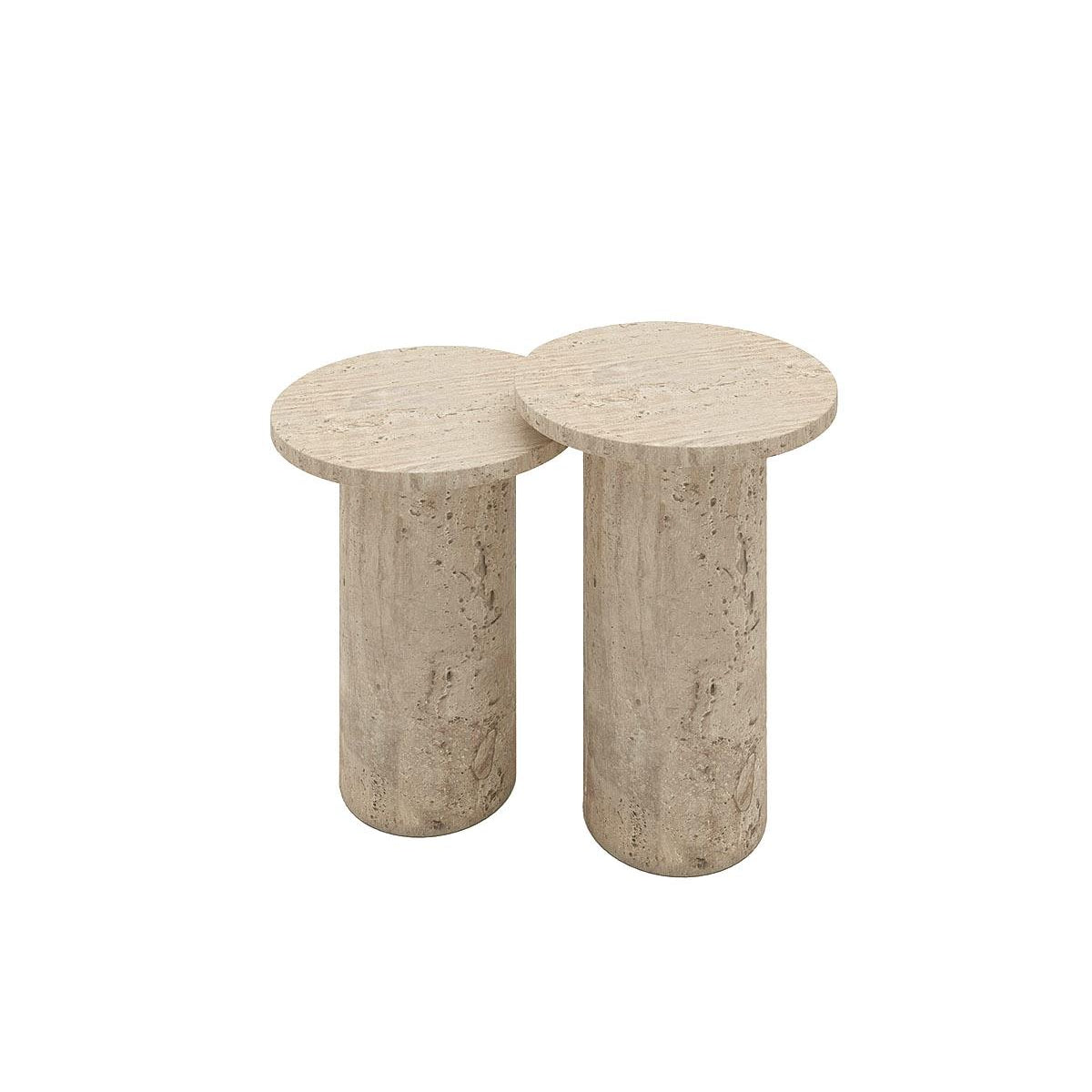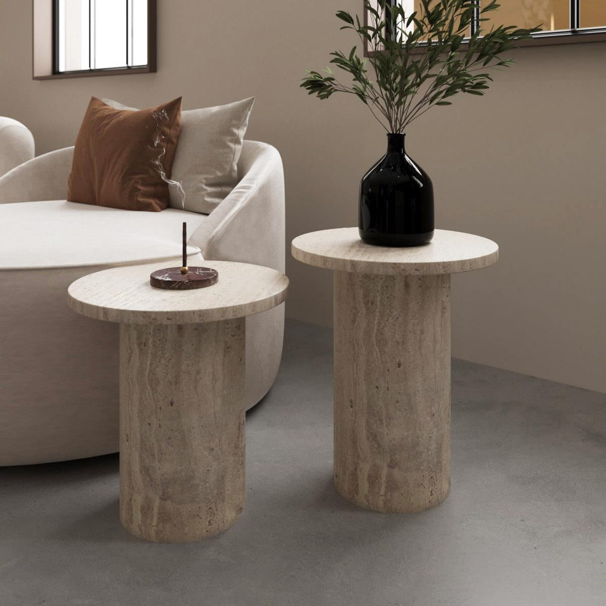 Pinot Traverten İkili Yan Sehpa, doğal traverten taşının zarafeti ile modern tasarımın şıklığını bir araya getiriyor.