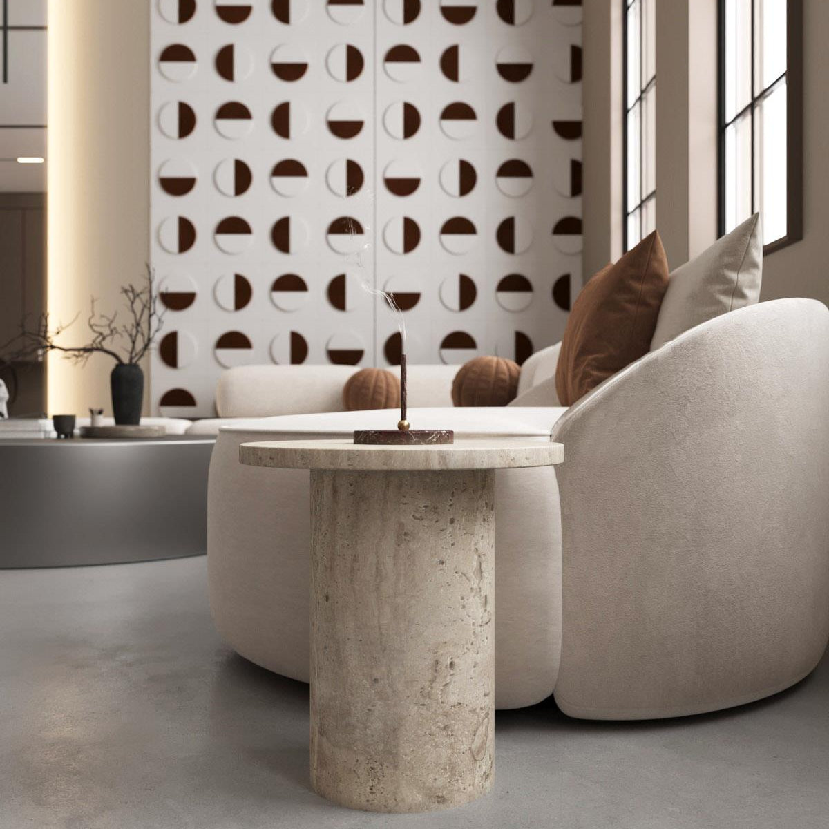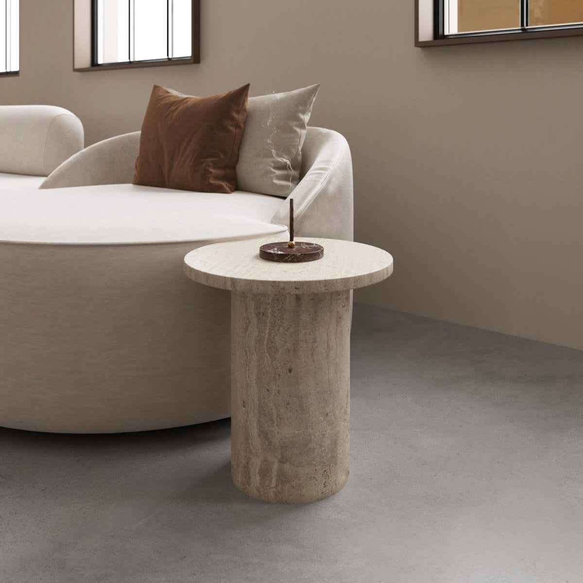 Pinot Traverten Küçük Boy Yan Sehpa, doğal traverten taşının zarafeti ile kompakt ve şık tasarımı bir araya getiriyor.