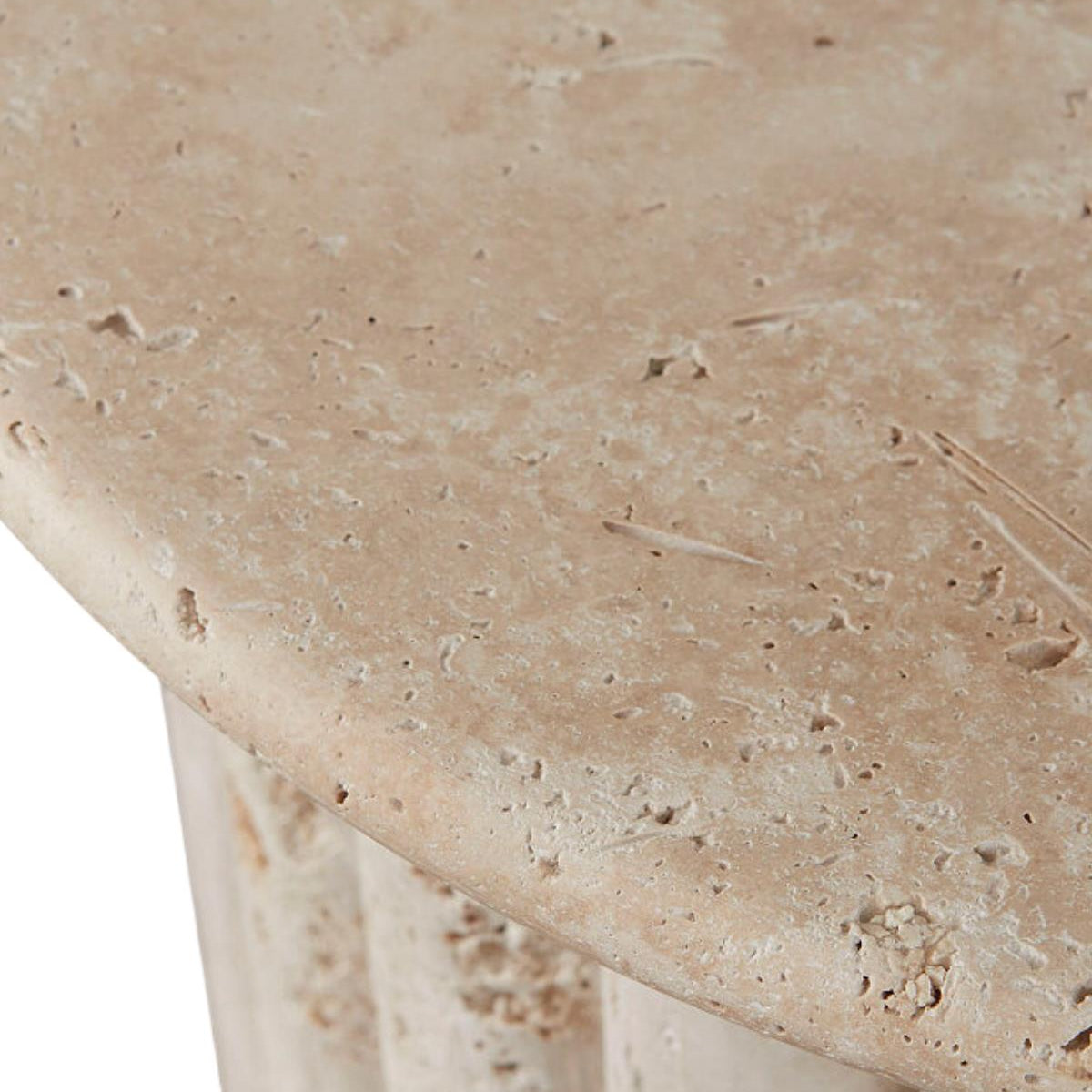 Sirena Traverten Yan Sehpa, doğal traverten taşının zarafeti ile modern tasarımın şıklığını bir araya getiriyor.