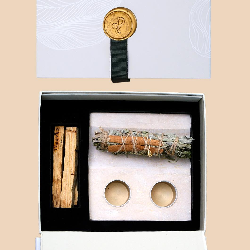 Aslan Burcu Meditasyon Seti, bitkisel tütsü demeti, 3 adet Palo Santo, traverten tütsülük ve özel tasarım kutudan oluşur.