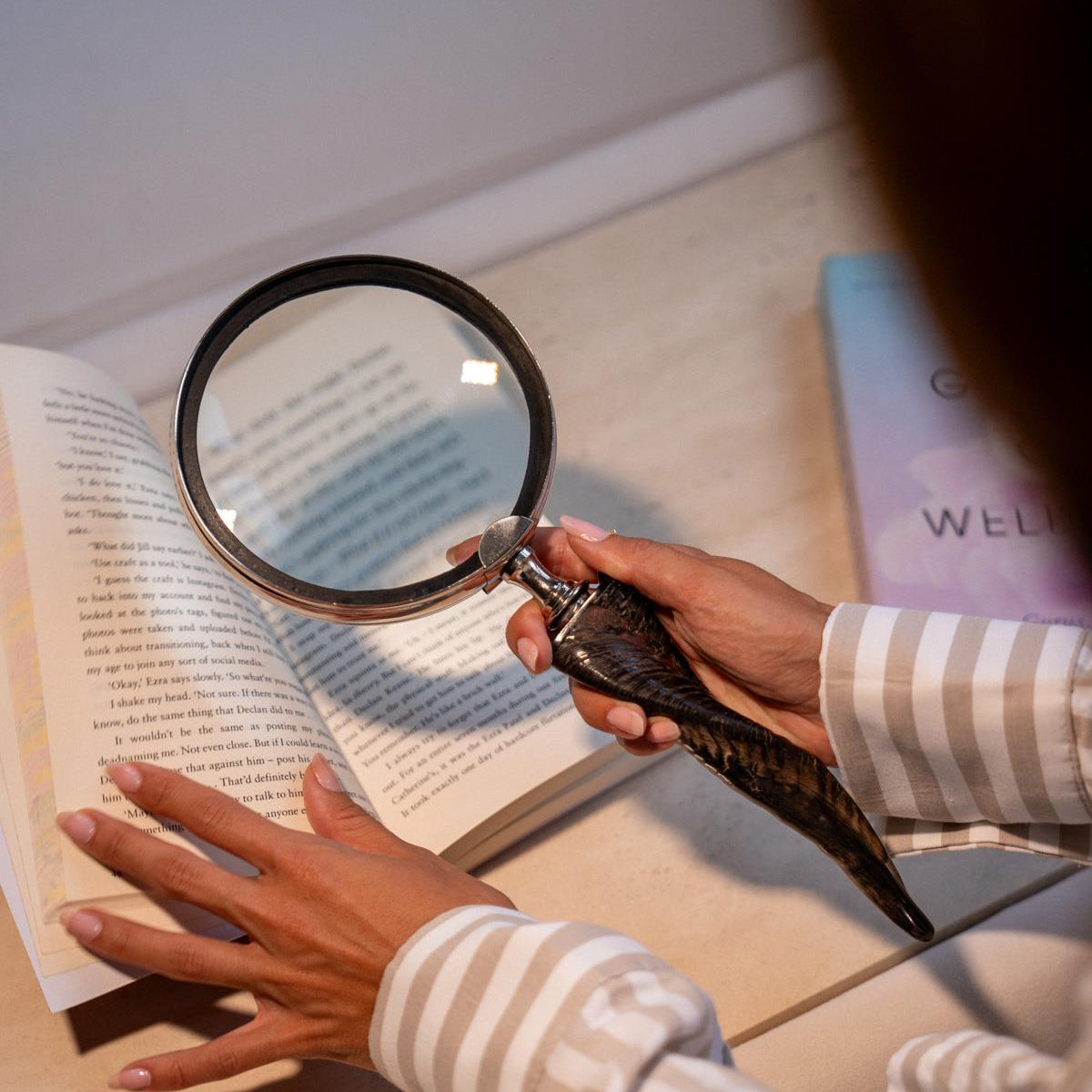 Metal ve doğal boynuzdan yapılmış sapı, ergonomik bir tutuş sağlar ve büyüteci kullanırken şıklık katar. 32x12.5 cm boyutundaki bu büyüteç, geniş büyütme alanı sunar ve pratik kullanım için ideal bir üründür. Hem işlevsel hem de dekoratif bir aksesuar olarak kullanılabilir, klasik ve modern iç mekanlara uyum sağlar