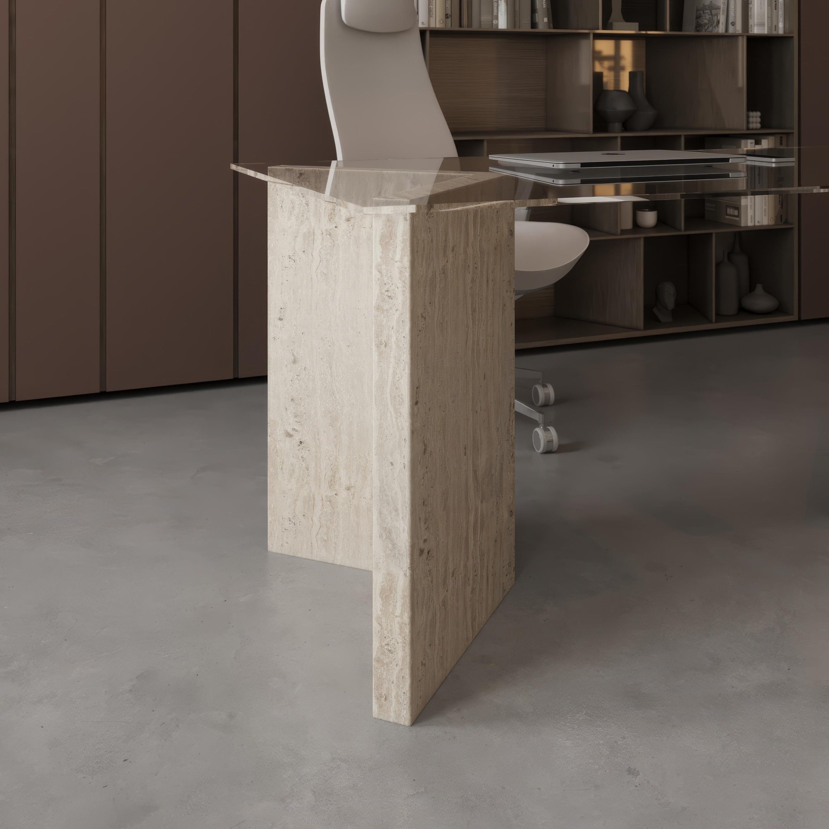 Tria Yemek Masası, üçgen formundaki traverten ayakları ve aralarındaki üçgen raflarıyla mekana modern bir görünüm katar.