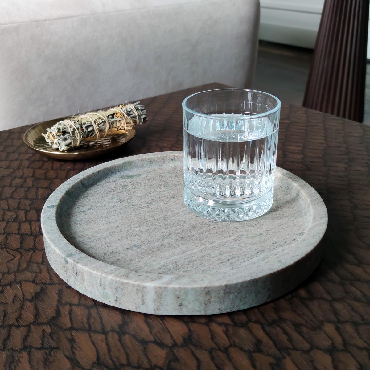 Düz ve yuvarlak hatlarıyla estetik bir görünüm sunan bu tepsi, mermerin sofistike havasını yansıtarak hem işlevsel hem de dekoratif bir parça olarak kullanılabilir. Günlük yaşamda rahatlıkla kullanılabileceği gibi, misafirlerinizi ağırlarken de şık bir aksesuar olarak öne çıkar