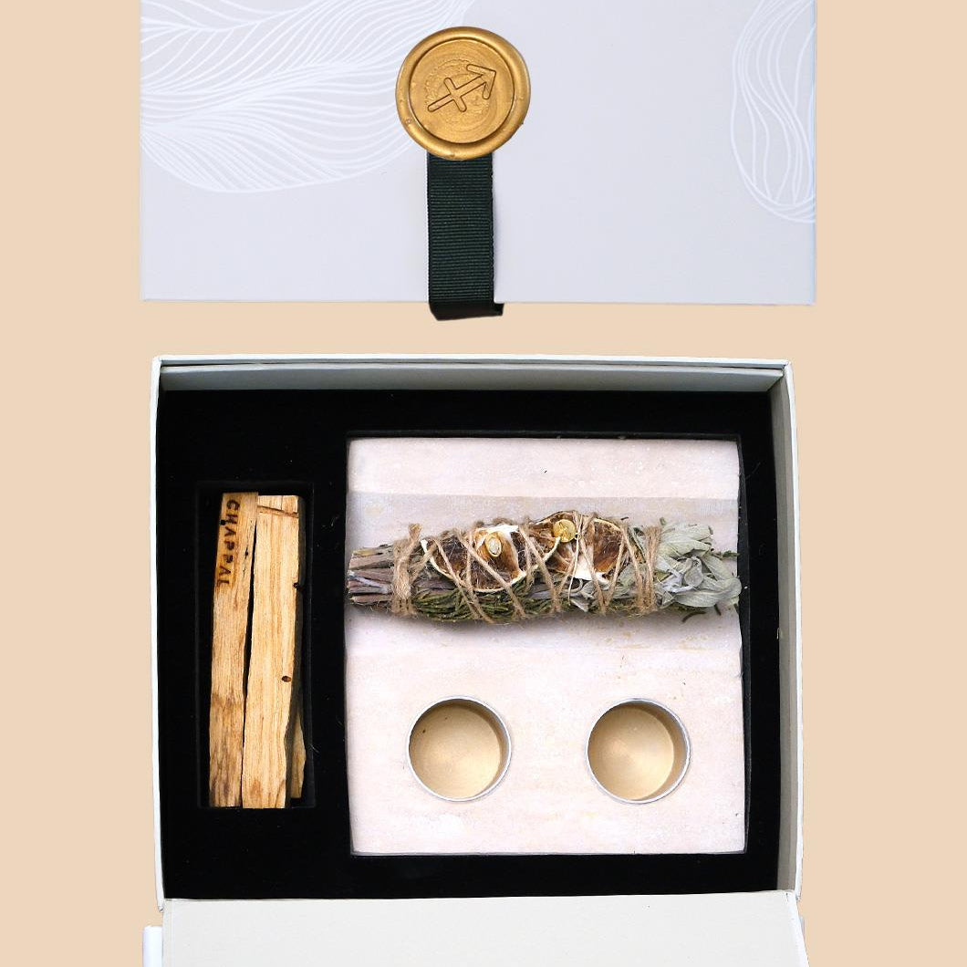 Yay Burcu Meditasyon Seti, bitkisel tütsü demeti, 3 adet Palo Santo, traverten tütsülük ve özel tasarım kutudan oluşur.