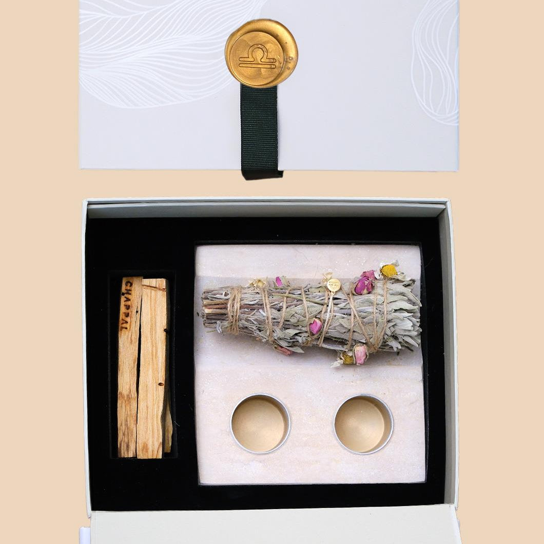 Terazi Burcu Meditasyon Seti, bitkisel tütsü demeti, 3 adet Palo Santo, traverten tütsülük ve özel tasarım kutudan oluşur.