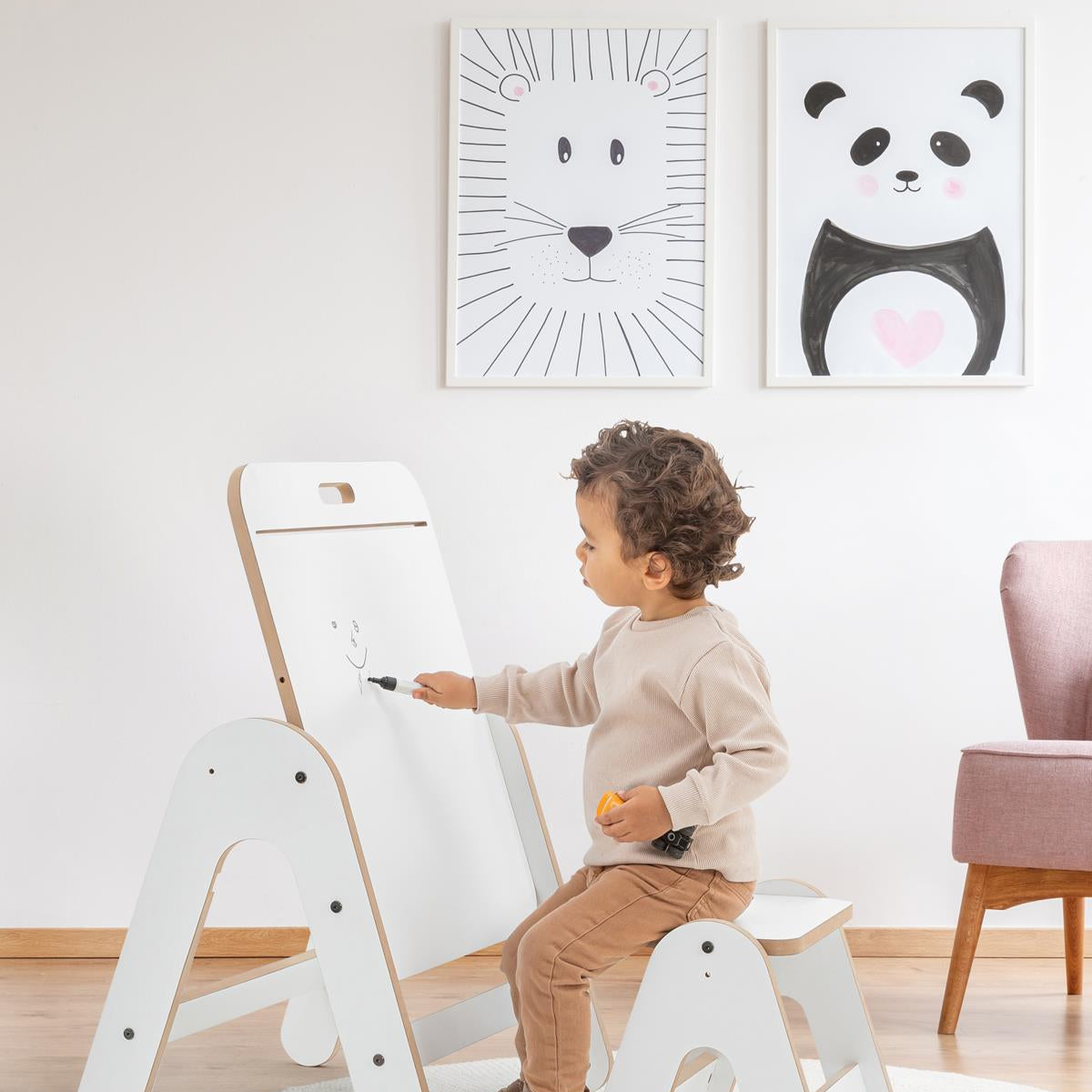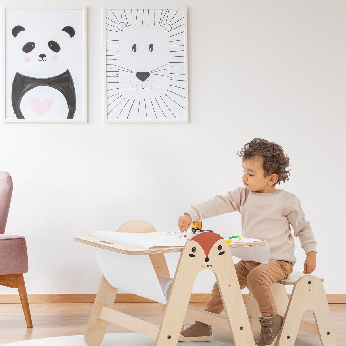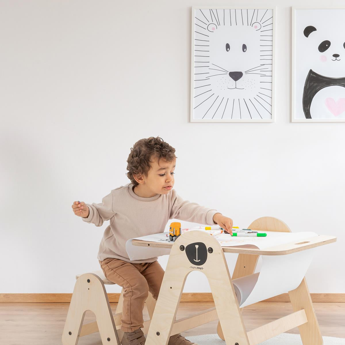 %100 doğal huş ağacından üretilmiş Massam Ayı Figürlü Ahşap Aktivite Masası, Montessori uyumlu tasarımıyla çocukların motor becerilerini geliştirir, yazı tahtası fonksiyonuyla yaratıcılıklarını destekler.