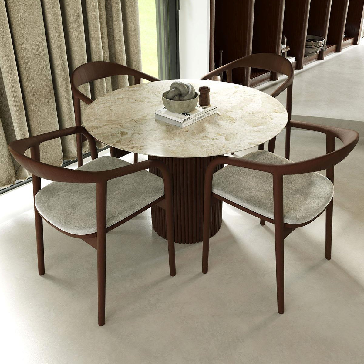 Mine Yemek Masası, ahşap ayakları ve traverten mermer üst tablası ile doğal malzemelerin kusursuz uyumunu sofralarınıza getiriyor.